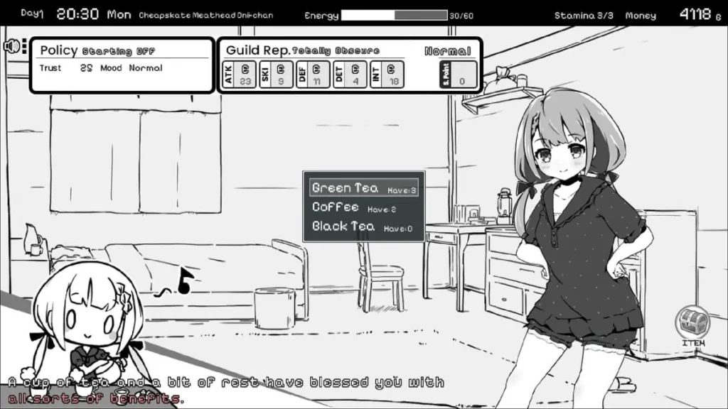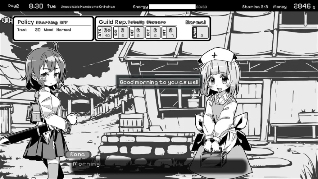 Each day, you have a chunk of energy to spend. Will you take on adventurer quests from the guild board for cash and small stat boosts? 💰 Will you train your combat skills at the guild? Or will you stay home, clean the house, or talk to your sister to nurture that all-important bond? The mouse-only controls make this cycle smooth and immersive—you’re just clicking through life, making small decisions that have huge ramifications.
